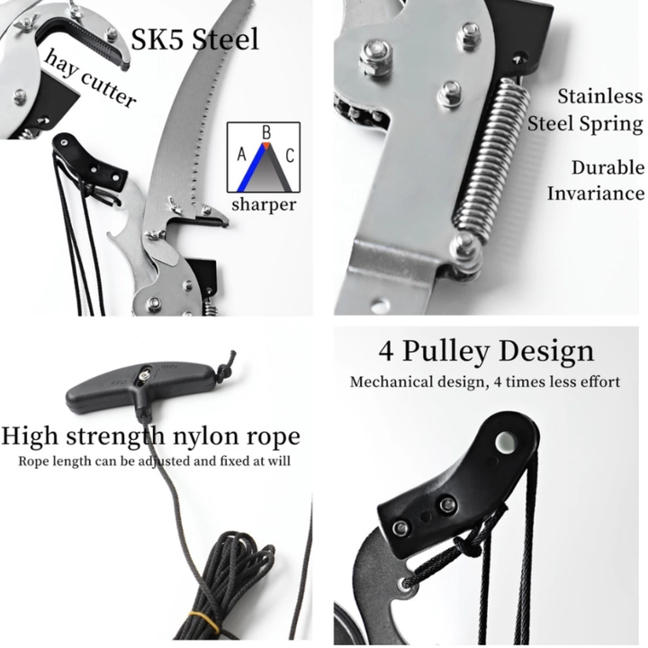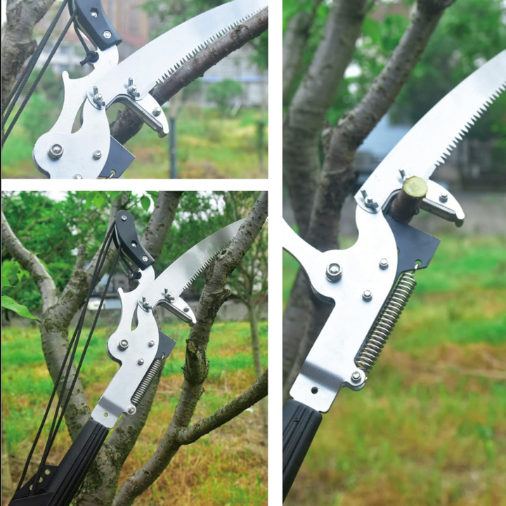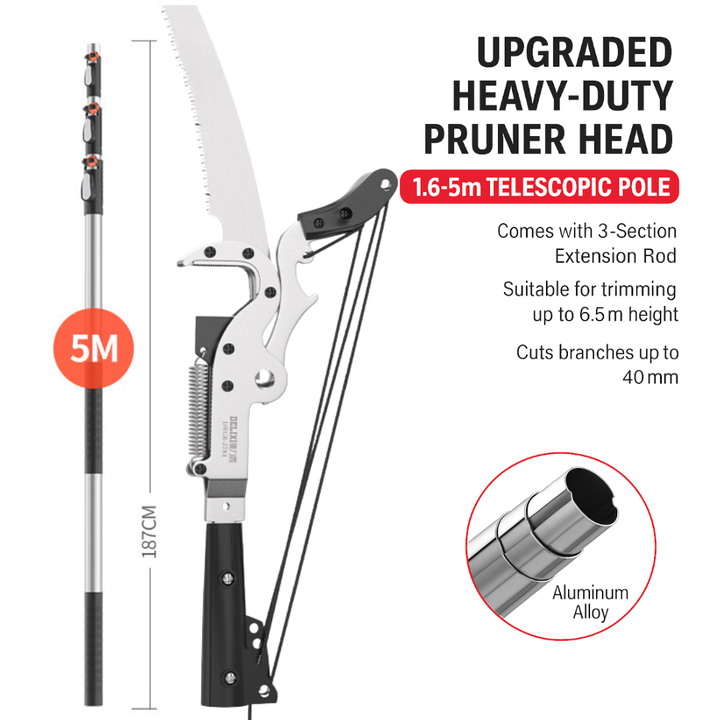 - Trim high branches safely from the ground with this 5m Telescopic Tree Pruner, equipped with a hardened SK5 steel saw blade and a 40mm heavy-duty lopper.